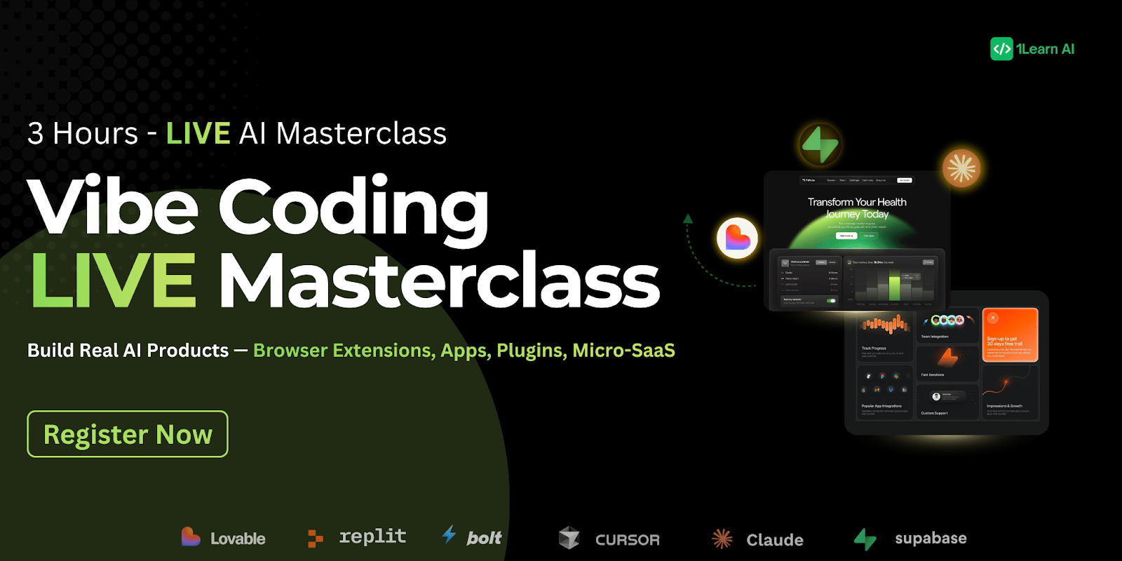 In this 3-hour LIVE Masterclass, you’ll learn how to turn your ideas into fully working apps using the most powerful AI tools — Lovable, Bolt, Cursor, Replit, Claude, Supabase and more.